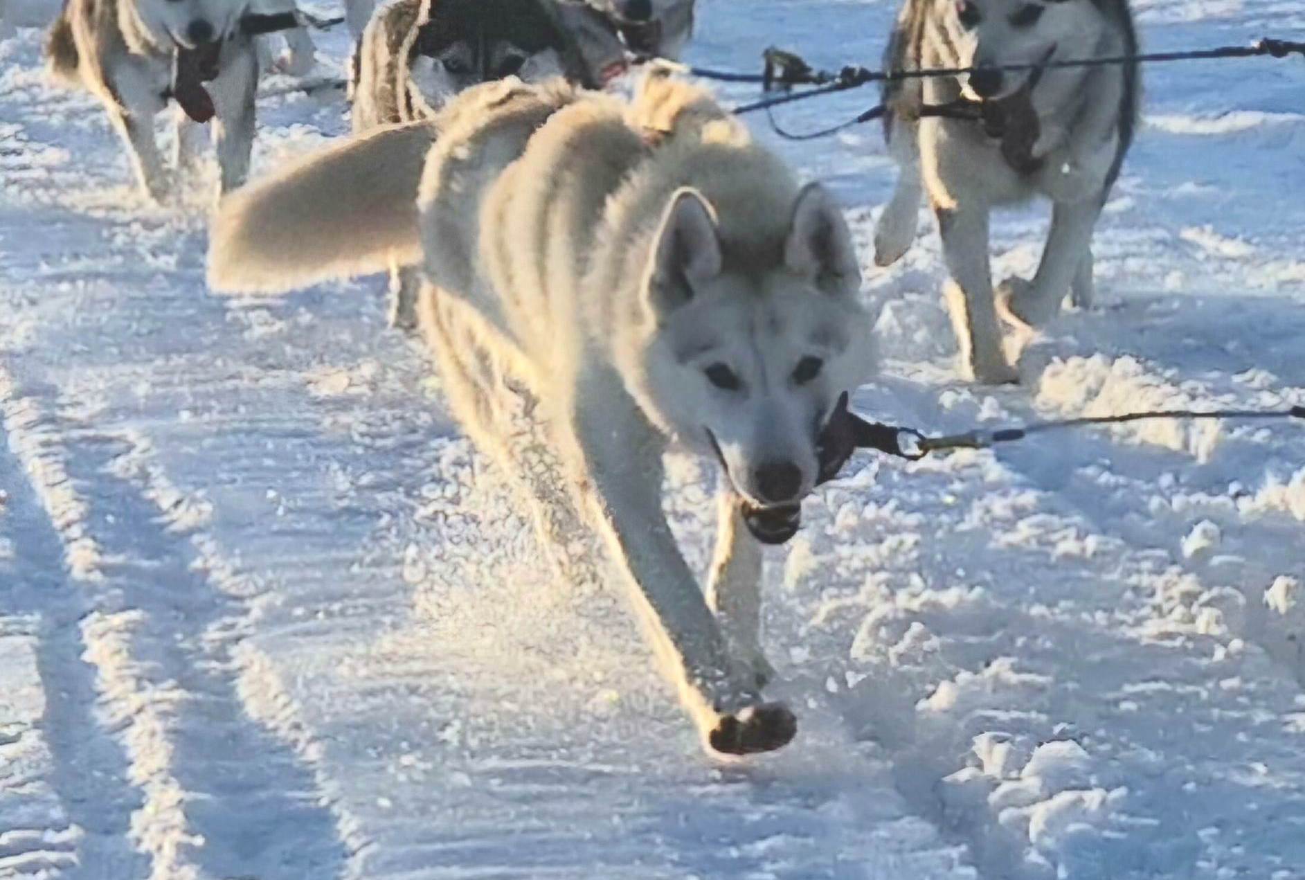 Iðunn is a daughter of Sól and Lennon born in 2023. Iðunn almost looks exactly like a young version of her mother so she is very pretty. She really really likes food and is a very promising lead dog so we might have a future breeding material here 😊 She is still a bit loud when she must wait but nobody is perfect. She also loves people but if there is a chance there is food anywhere close she checks that out first before she says HI.