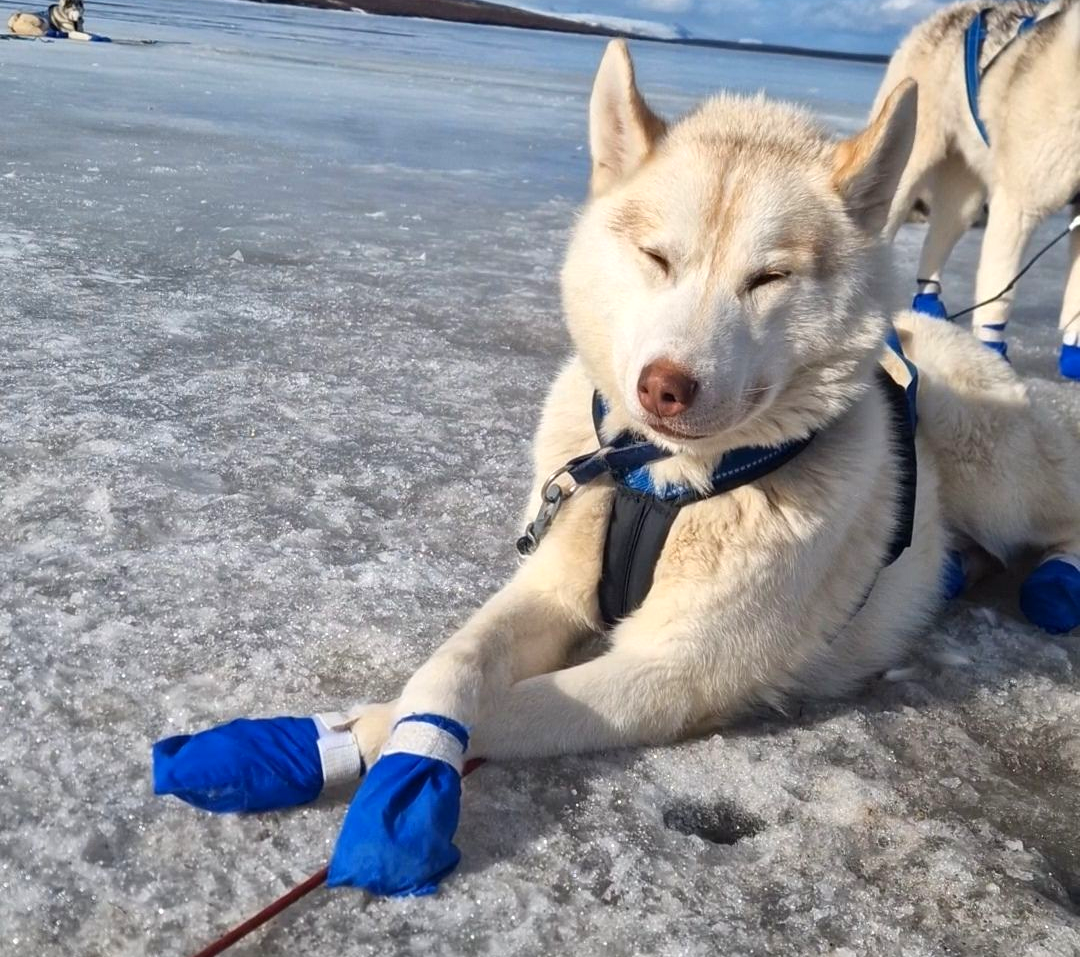She is a very lovely young dog that I had high hopes for being a leader but she is not focused enough on the trail. She likes to look at grass and stones and eat snow.